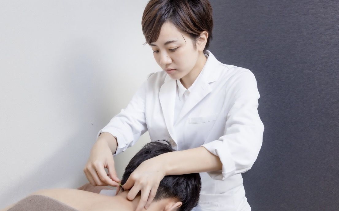 首肩の緊張緩和と眼精疲労軽減を目的に鍼施術を実施。