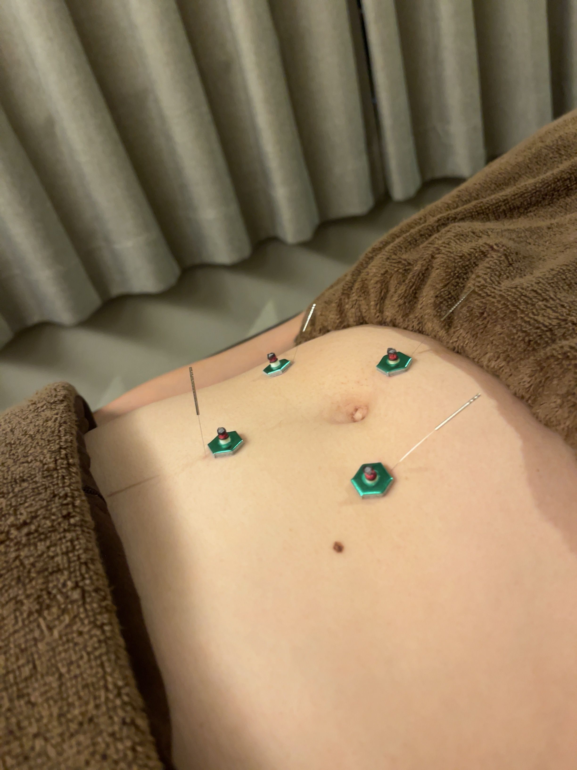 骨盤内循環の改善と自律神経調整を目的に、腹部・腰部・背部兪穴を中心に鍼灸施術を実施。