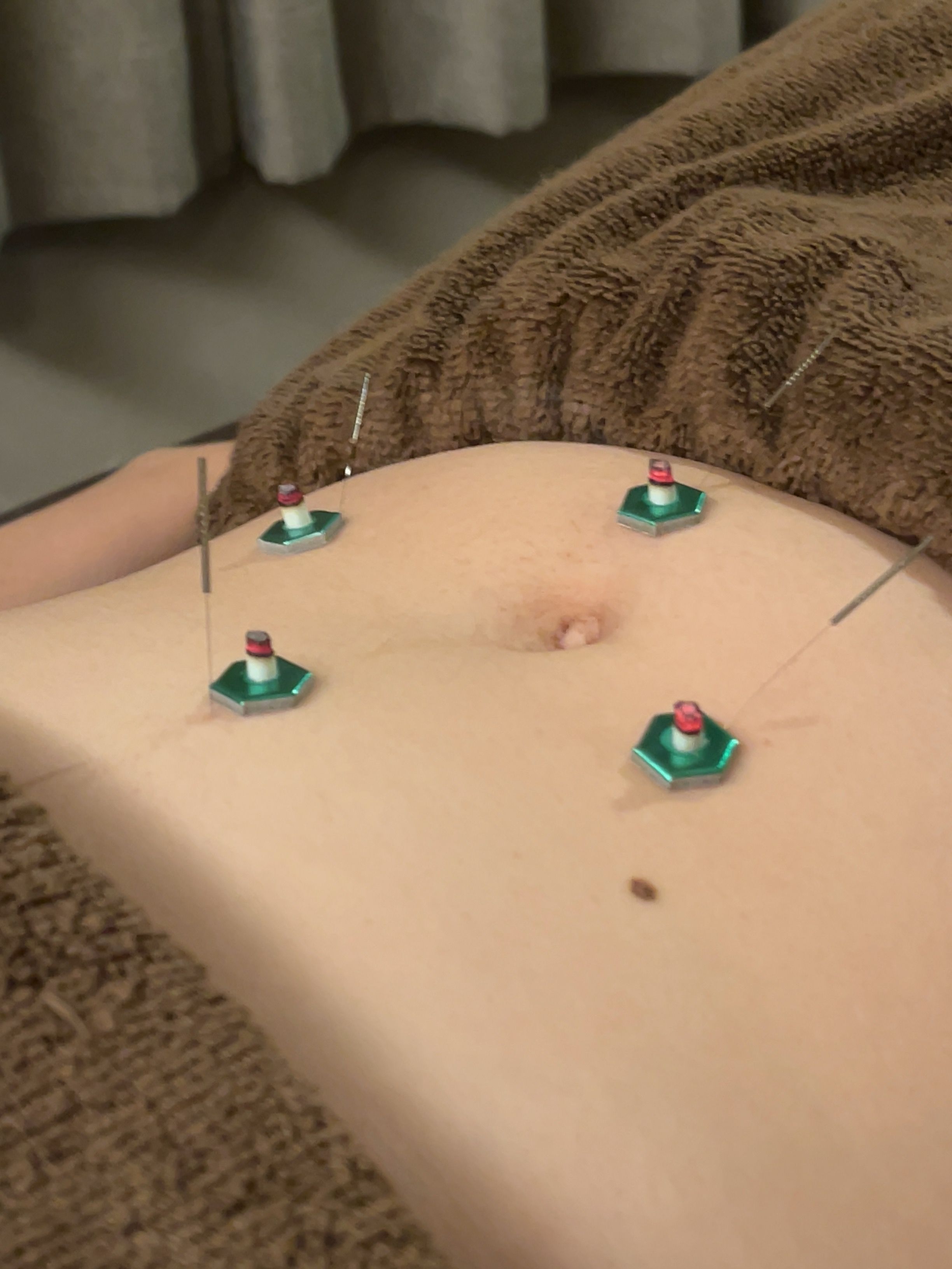 自律神経調整と消化機能の安定を目的に、後頭部・背部・腹部への鍼施術を実施。
