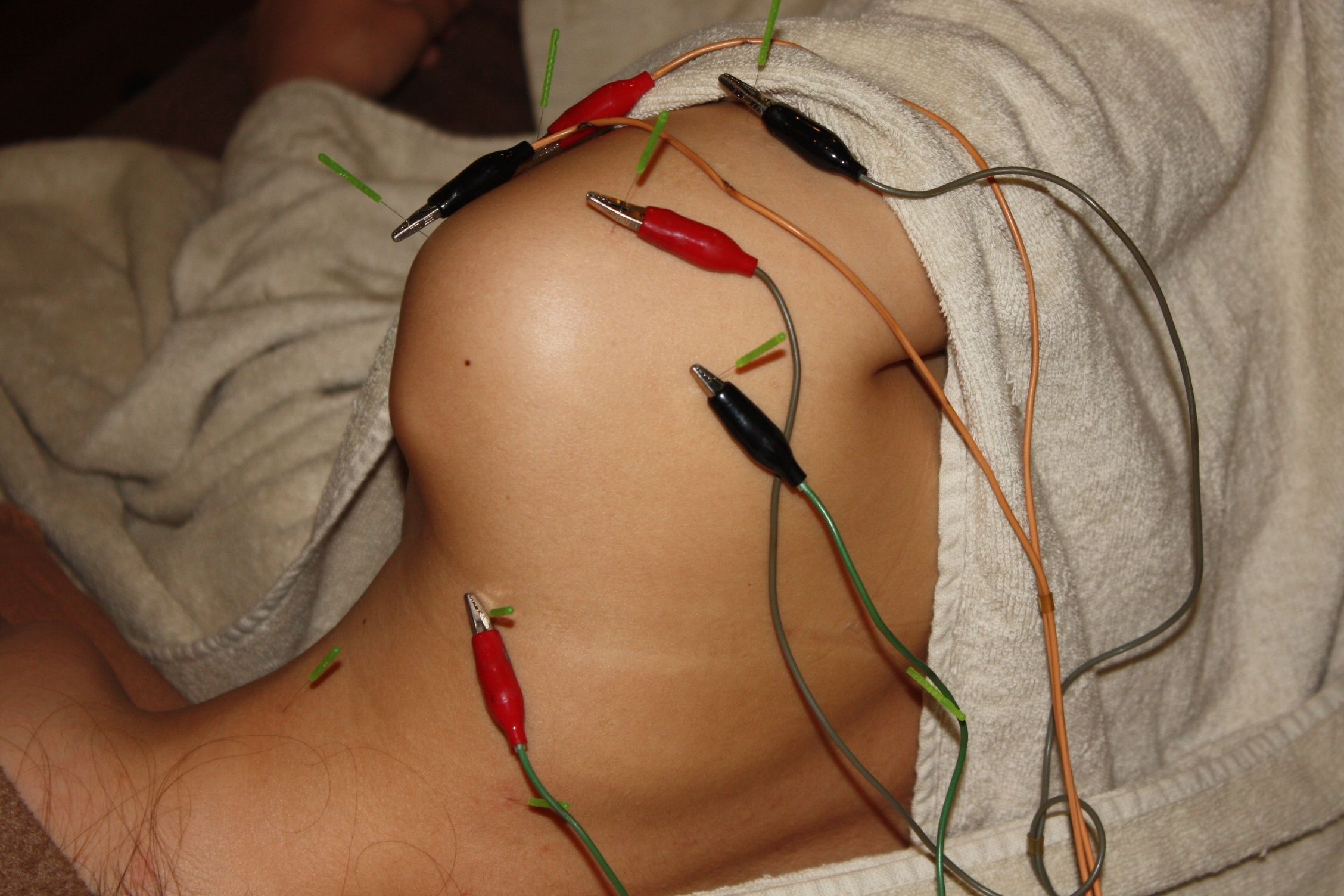 自律神経調整と肩関節周囲の血流改善を目的に、全身調整の鍼施術を実施。