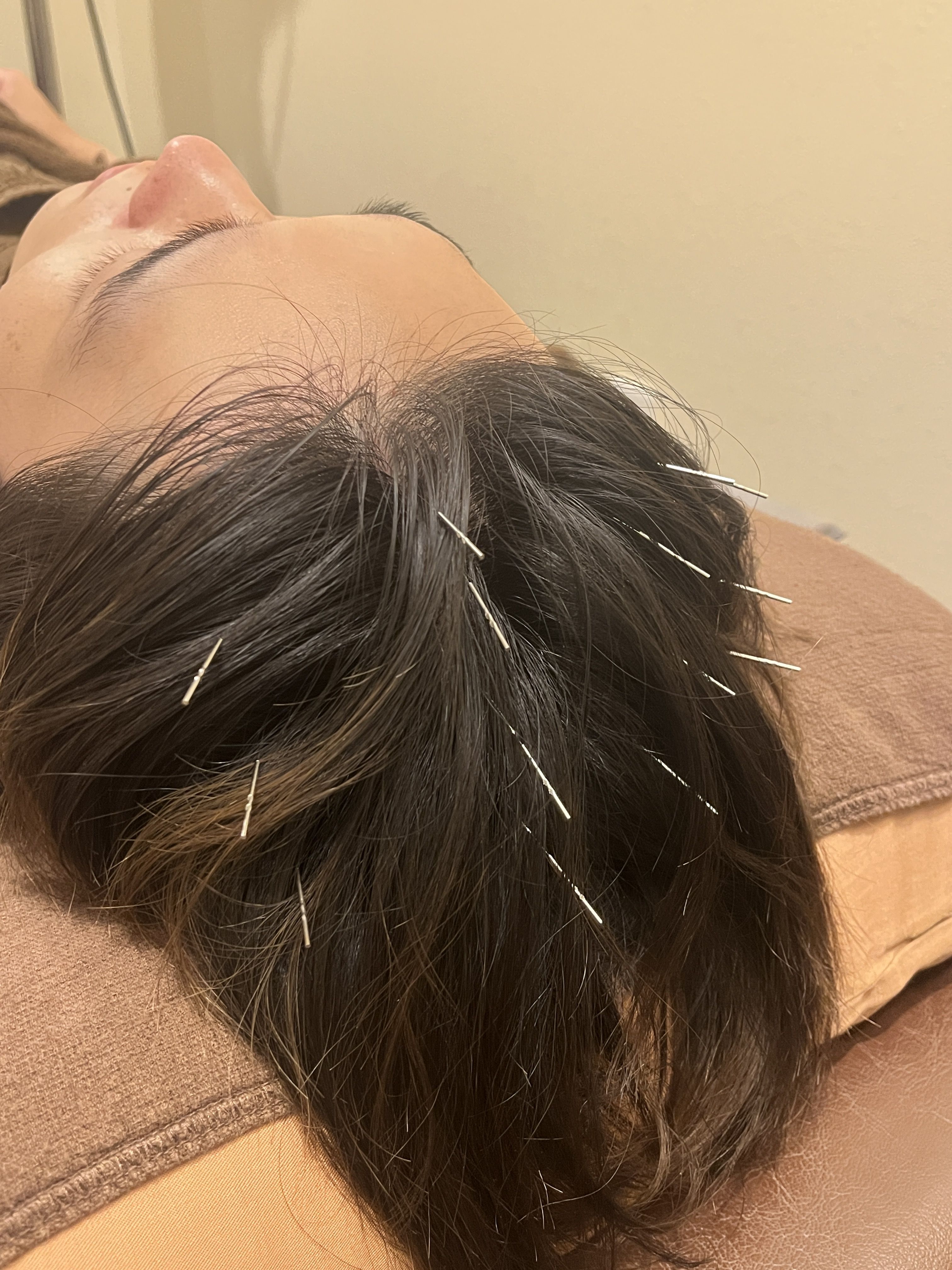 自律神経の安定とストレス緩和を目的に、後頭部・背部兪穴を中心に鍼施術。